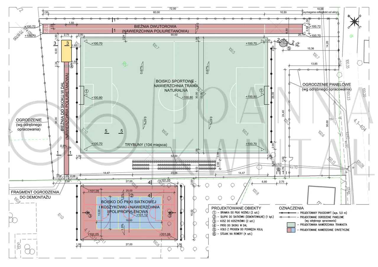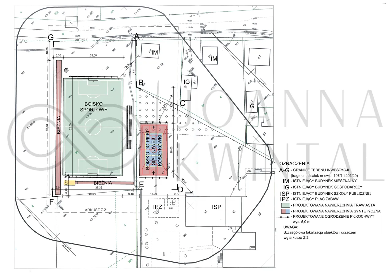 Projekt zakładał wykonanie boiska do piłki nożnej o nawierzchni z trawy naturalnej, boiska wielofunkcyjnego o nawierzchni poliuretanowej, budowę bieżni dwutorowej, bieżni do skoku w dal, rzutni do pchnięcia kulą, a także budowę piłkochwytów i trybun.