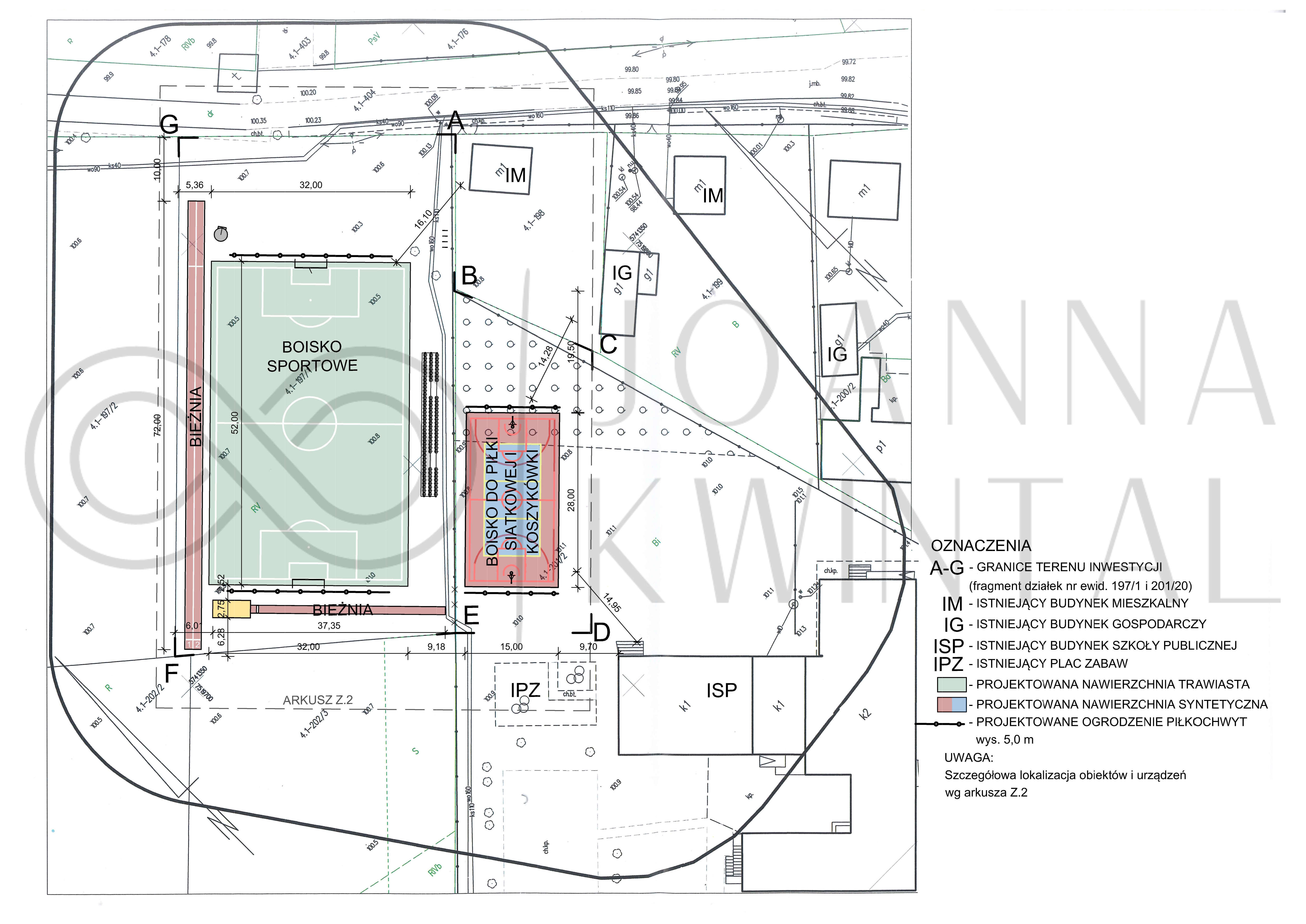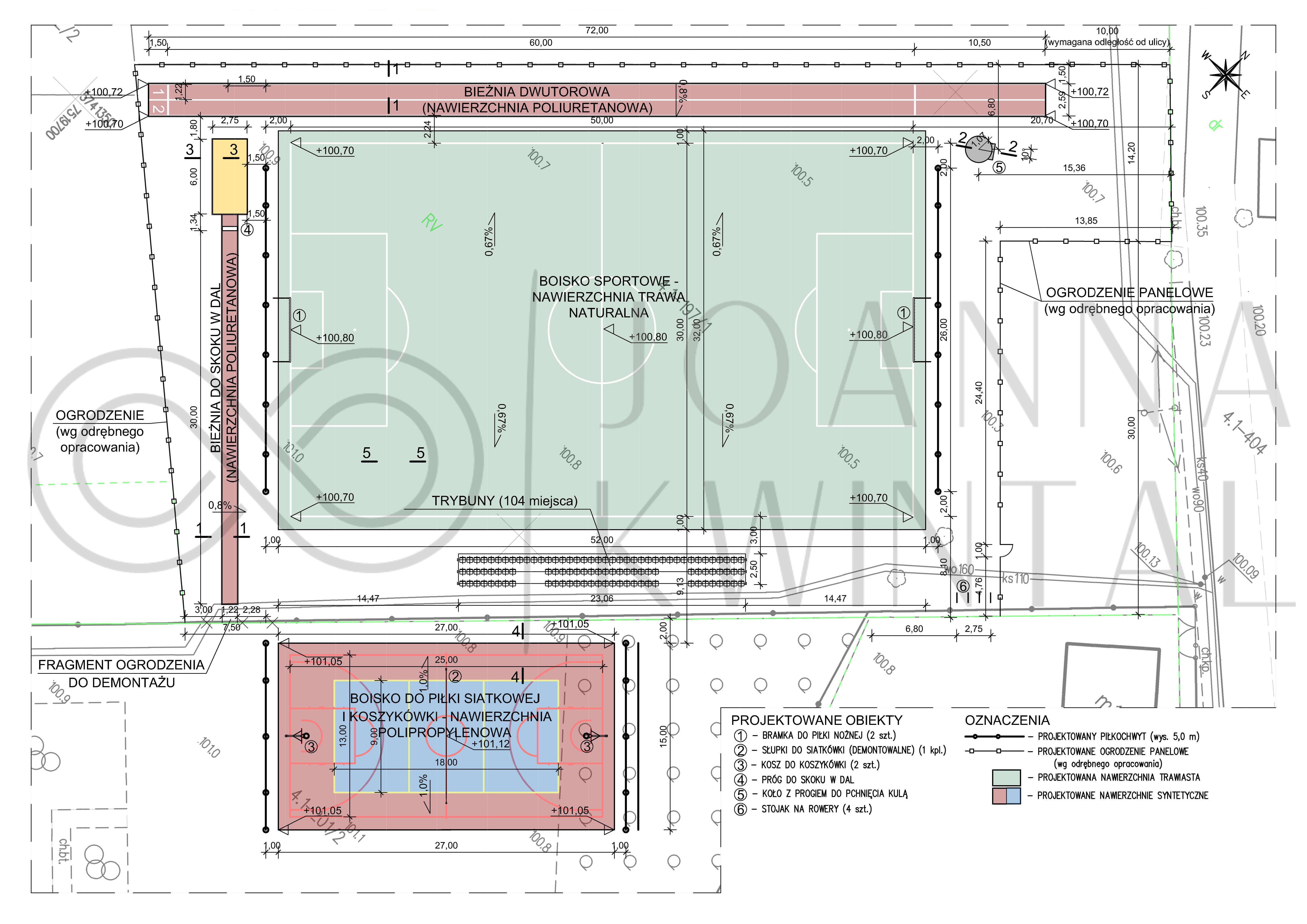 Projekt zakładał wykonanie boiska do piłki nożnej o nawierzchni z trawy naturalnej, boiska wielofunkcyjnego o nawierzchni poliuretanowej, budowę bieżni dwutorowej, bieżni do skoku w dal, rzutni do pchnięcia kulą, a także budowę piłkochwytów i trybun.