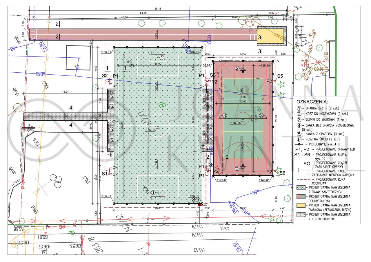 Projekt przebudowy istniejących boisk przyszkolnych oraz birżni rekreacyjnej. W miejscu boiska do piłki nożnej z trawy naturalnej zaprojektowano boisko o nawierzchni z trawy syntetycznej. W miejscu boiska wielofunkcyjnego o nawierzchni bitumicznej zaprojektowano boisko z nawierzchnią poliuretanową dostosowane do gry w koszykówkę oraz siatkówkę. Projekt zakłada także przebudowę nawierzchni bieżni połączonej z zeskocznią.