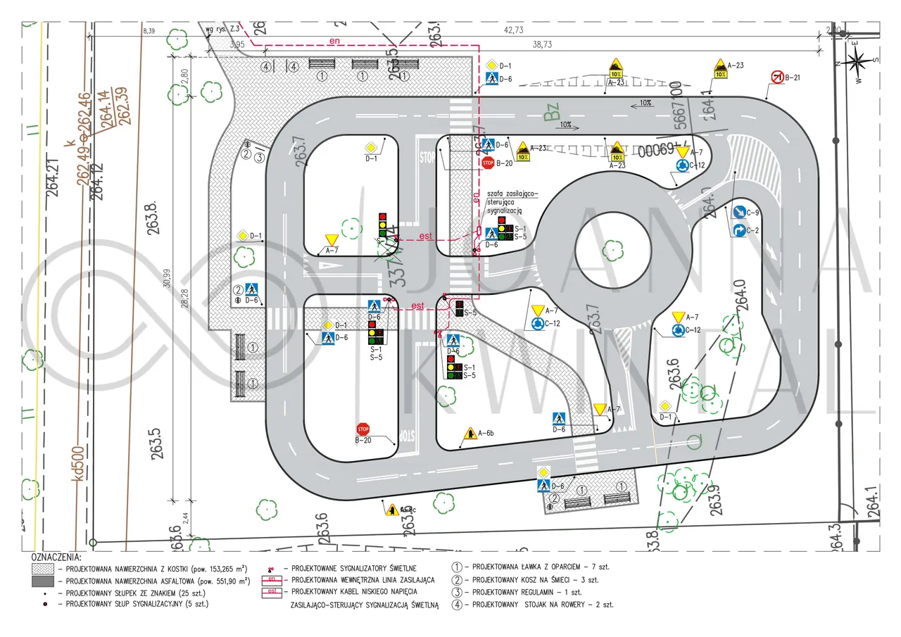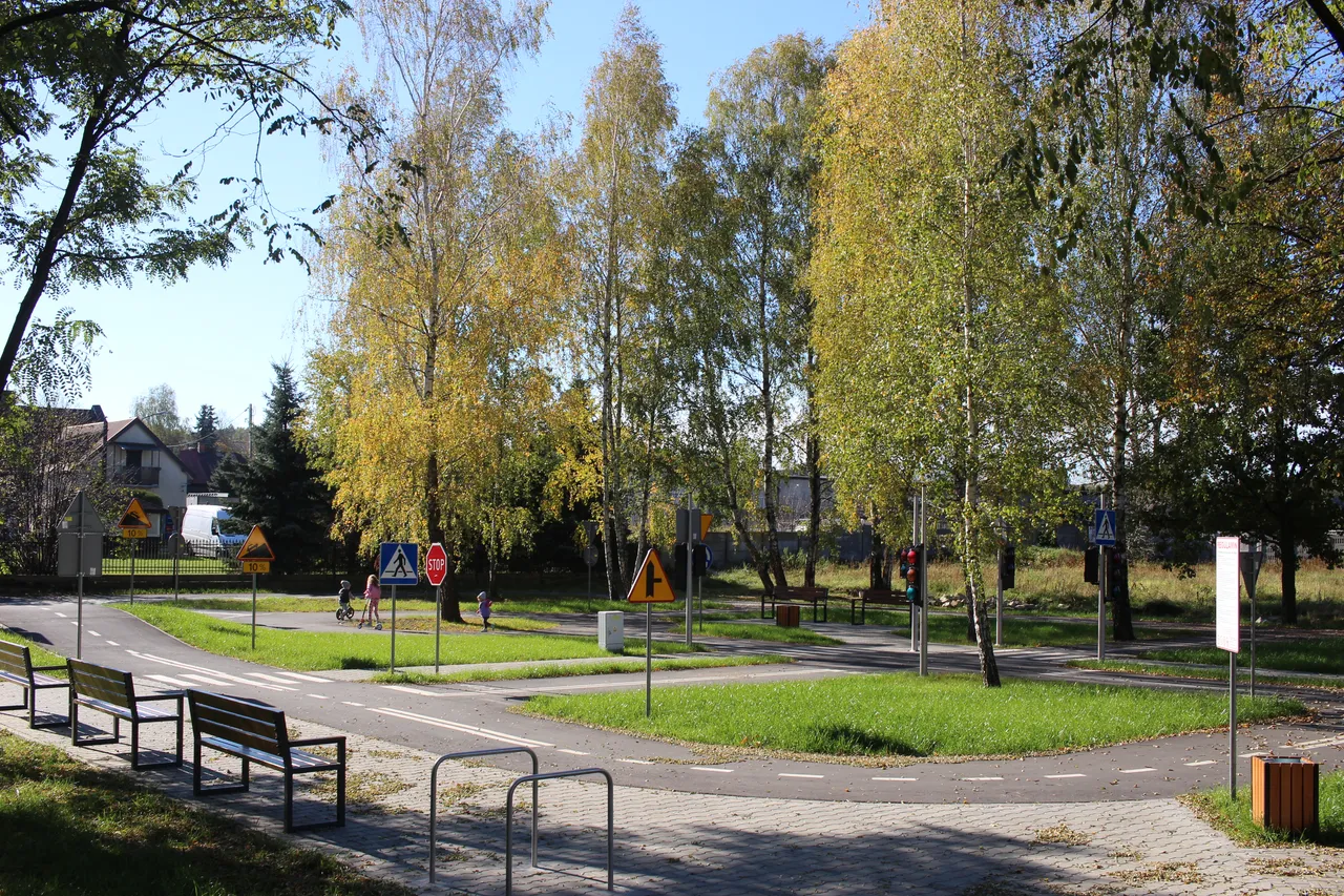 Projekt budowy miasteczka ruchu drogowego służącego do poruszania się na rowerach, hulajnogach i rolkach. Wykonano alejki z nawierzchni bitumicznej, oznakowanie poziome i pionowe oraz sygnalizację świetlną. Projekt uwzględniał ochronę istniejącego drzewostanu, co pozwoliło uzyskać ciekawy obiekt z naturalnym zacienieniem.
