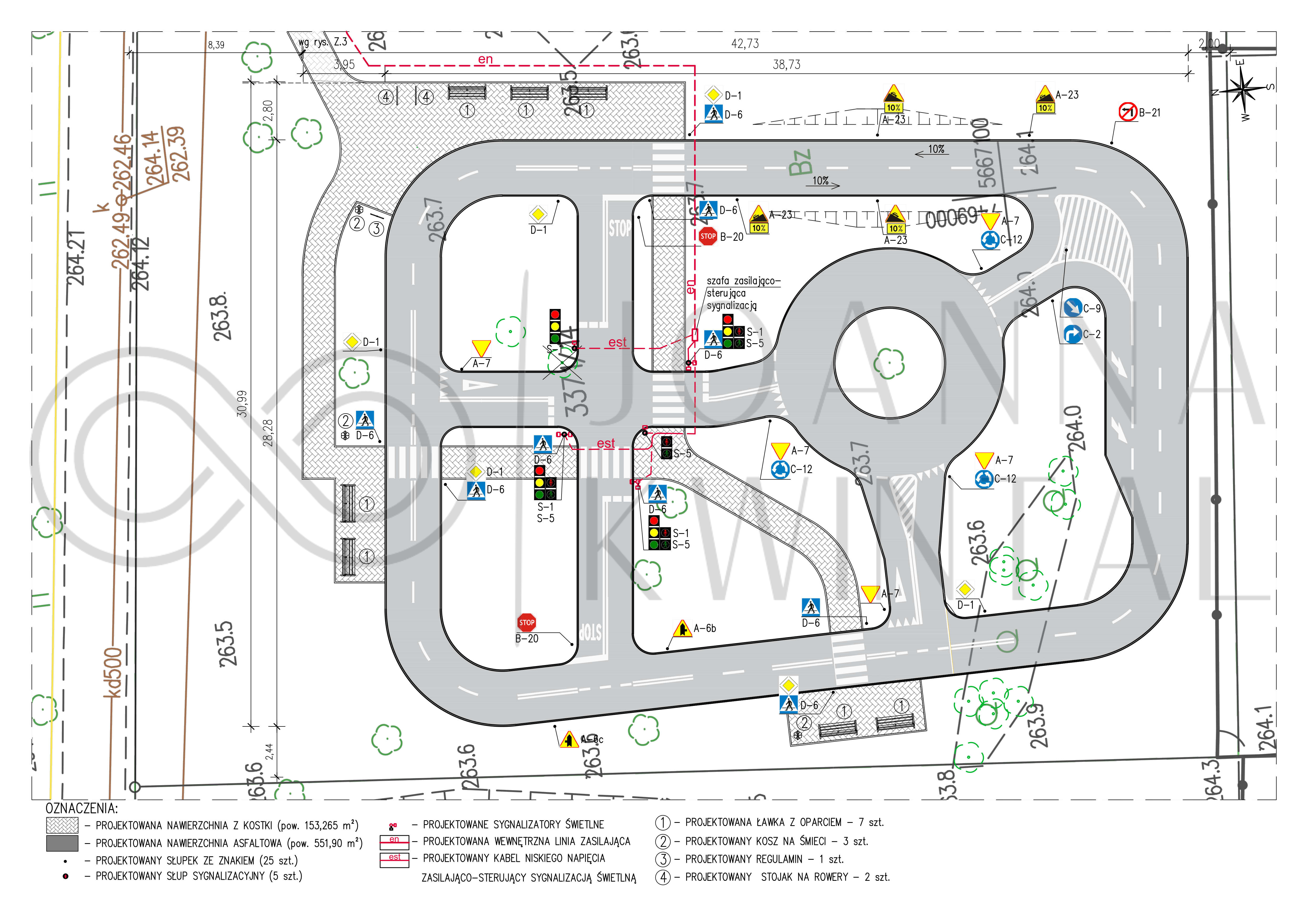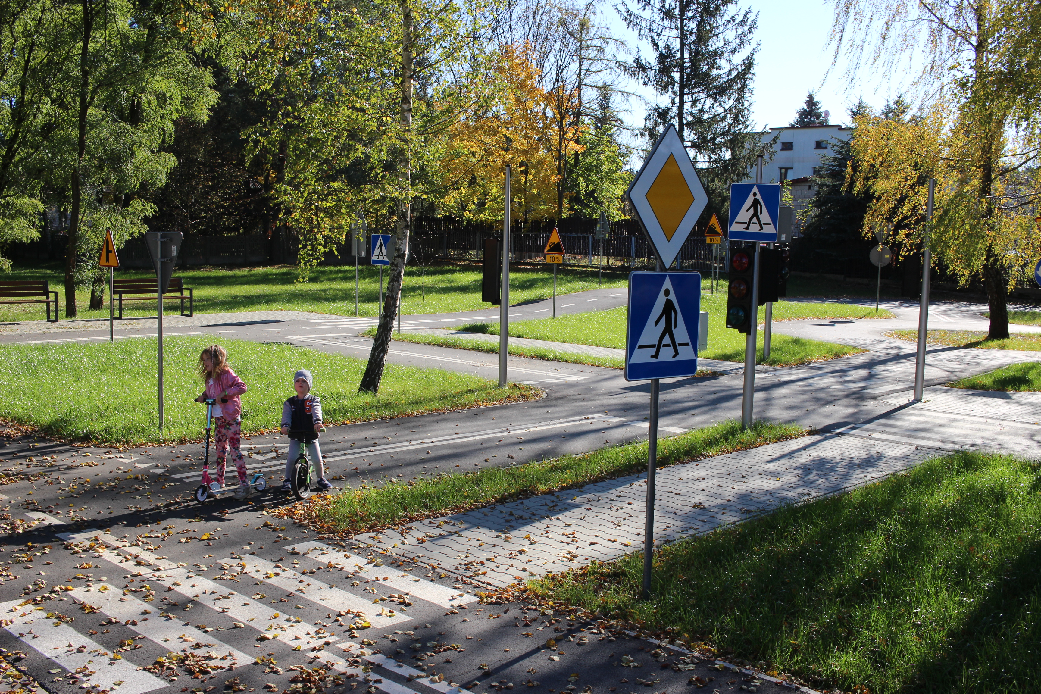 Projekt budowy miasteczka ruchu drogowego służącego do poruszania się na rowerach, hulajnogach i rolkach. Wykonano alejki z nawierzchni bitumicznej, oznakowanie poziome i pionowe oraz sygnalizację świetlną. Projekt uwzględniał ochronę istniejącego drzewostanu, co pozwoliło uzyskać ciekawy obiekt z naturalnym zacienieniem.