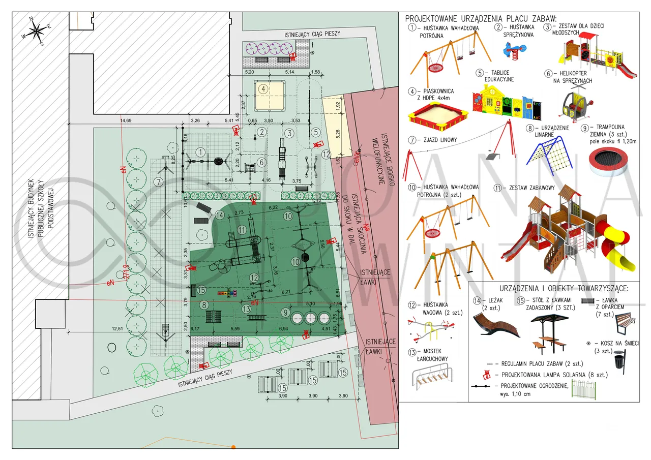Projekt boiska przy Zespole Szkolno-Przedszkolnym. W północnej części placu zaprojektowano strefę dla dzieci przedszkolnych, natomiast w południowej dla dzieci szkolnych. Strefy oddzielone są od siebie pasem zieleni. Na placu zaprojektowano nawierzchnie dostosowane do wysokości swobodnego upadku urządzeń. Projekt uwzględniał także budowę oświetlania solarnego oraz obiektów rekreacyjnych (leżaki, zadaszone stoliki).