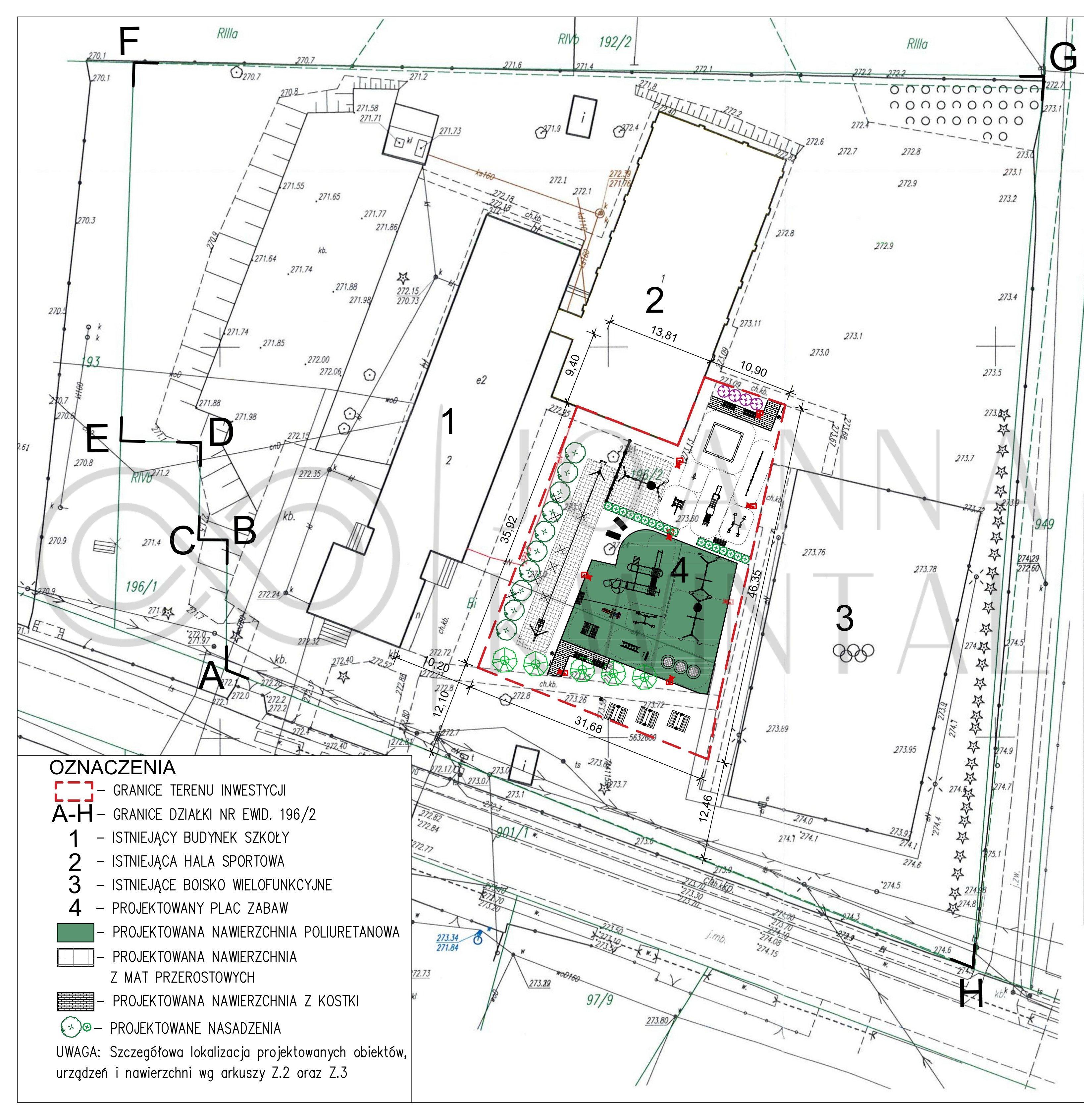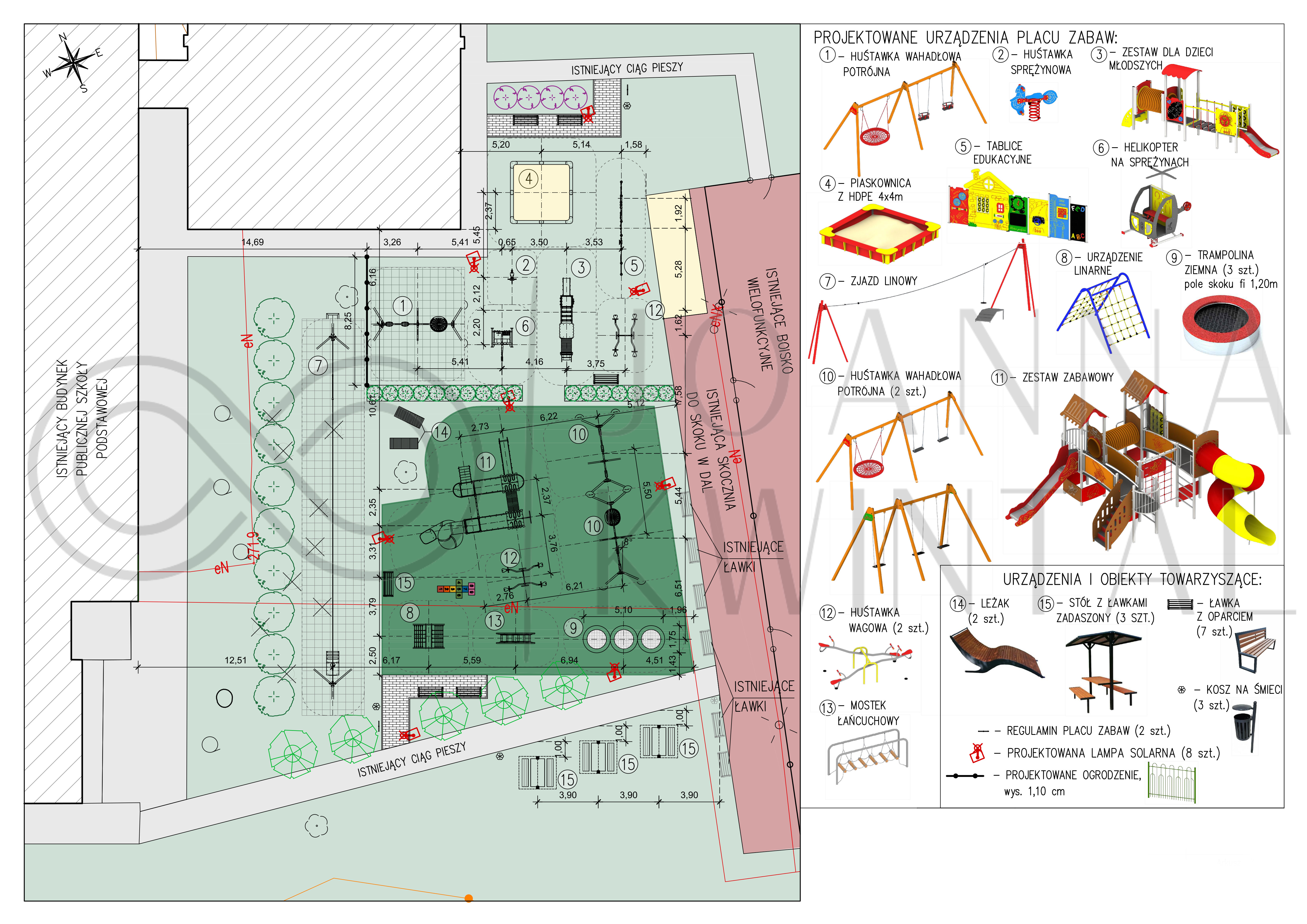 Projekt boiska przy Zespole Szkolno-Przedszkolnym. W północnej części placu zaprojektowano strefę dla dzieci przedszkolnych, natomiast w południowej dla dzieci szkolnych. Strefy oddzielone są od siebie pasem zieleni. Na placu zaprojektowano nawierzchnie dostosowane do wysokości swobodnego upadku urządzeń. Projekt uwzględniał także budowę oświetlania solarnego oraz obiektów rekreacyjnych (leżaki, zadaszone stoliki).