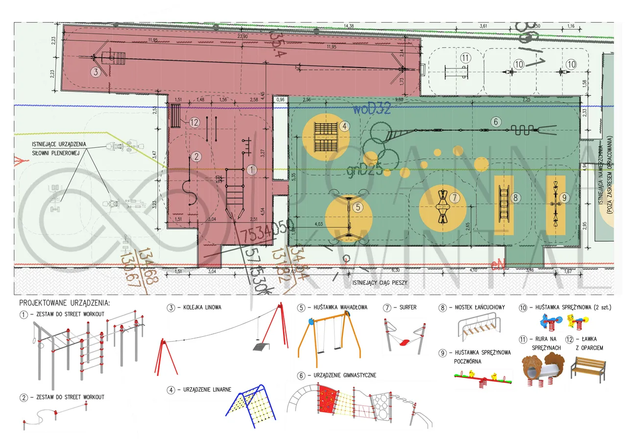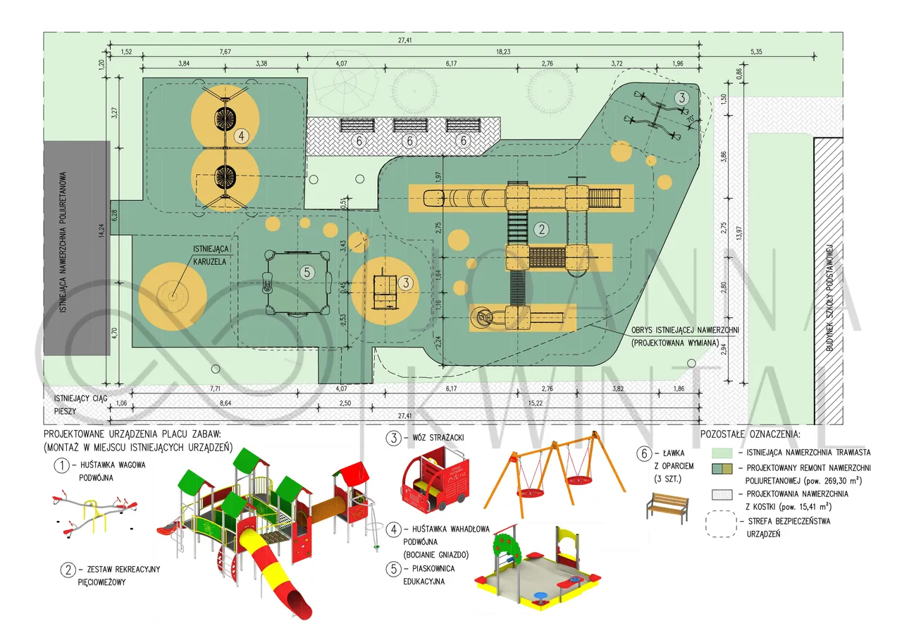 Projekt uwzględniał wymianę zniszczonej nawierzchni oraz urządzeń, przy okazji zaplanowano nowy układ funkcjonalny placu oraz urządzenia, które zapewnią zabawę i rozwój fizyczny zarówno dzieciom w wieku przedszkolnym, jak i szkolnym. Realizacja odbywały się w dwóch etapach.